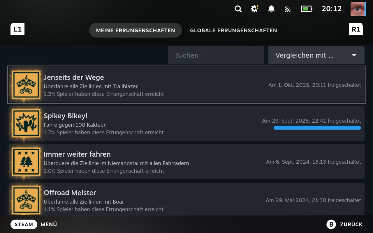 Was für ein Ritt mit diesem Spiel. Auch lief es die Tage gut. Ich habe seit fast genau einem Jahr mal wieder zwei Erungenschaften freigeschaltet. Aber das liegt wohl daran, dass ich hauptsächlich nur noch die Daily Rides fahre.